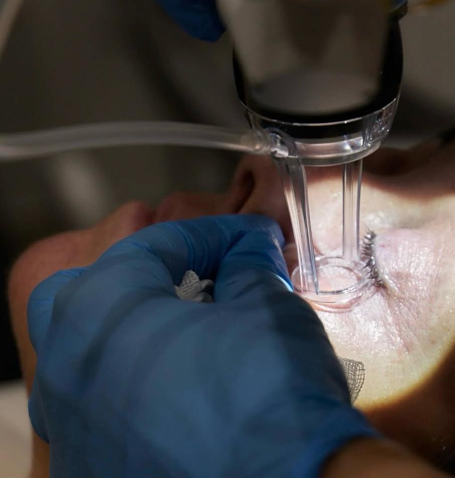 - Utiliza un láser ablativo fraccionado, generando una evaporización de los tejidos, retensando la piel , tanto de los párpados superiores como de los inferiores , en aquellas fases incipientes donde todavía no hay mucha piel sobrante. Consigue además eliminar arrugas de alrededor del ojo y mejorar la textura y tono de la piel.